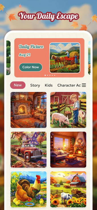 该应用程序还包括策划的主题集合,反映了季节的变化和农场生活的美。用户可以在个人画廊中保存他们完成的艺术作品,并轻松与朋友和家人分享。乡村色彩作为一个数字避风港,邀请用户重新与自然连接,释放他们的艺术潜力。体验乡村的宁静,今天就开始你的着色之旅。